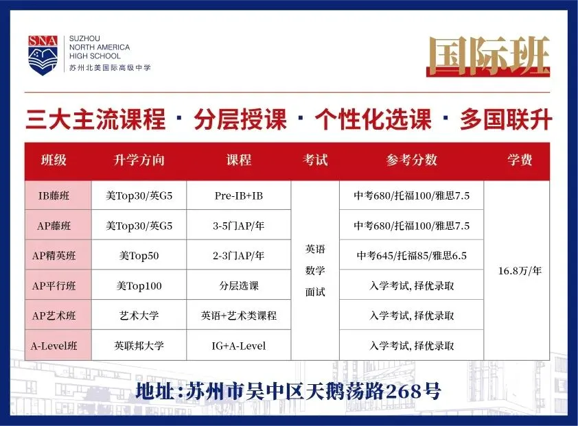苏州北美国际高级中学以多轨运行,个性化选课、优质资源整合、升学规划辅助为亮点,走向全球。