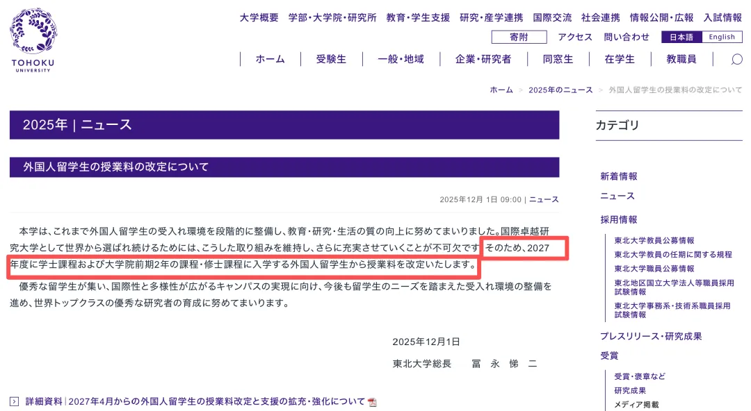 日本东北大学正式官宣自 2027 学年起,外国留学生学费将从每年 53.58 万日元(约 2.4 万人民币)暴涨至 90 万日元(约 4.1 万人民币),涨幅高达 1.7 倍!