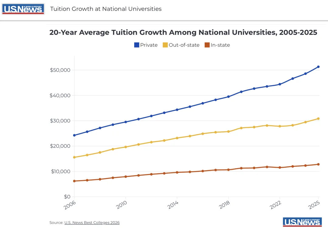 私立大学本科学费平均涨幅约 5%,哥伦比亚大学、宾夕法尼亚大学等院校涨幅达 6%-7%;公立大学对国际生学费调整更显著,加州系大学、密歇根大学的国际生学费涨幅普遍超 7%。STEM 专业的整体费用更是持续攀升,完成 CS (计算机科学)硕士总成本可能在 $80,000–$120,000(约58万-87万人民币)。