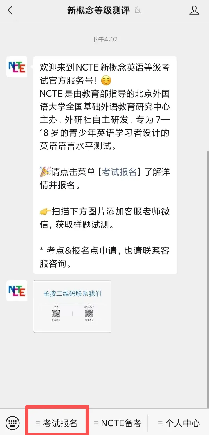 打开微信,搜索并关注考试官方服务号:“新概念等级测评”。