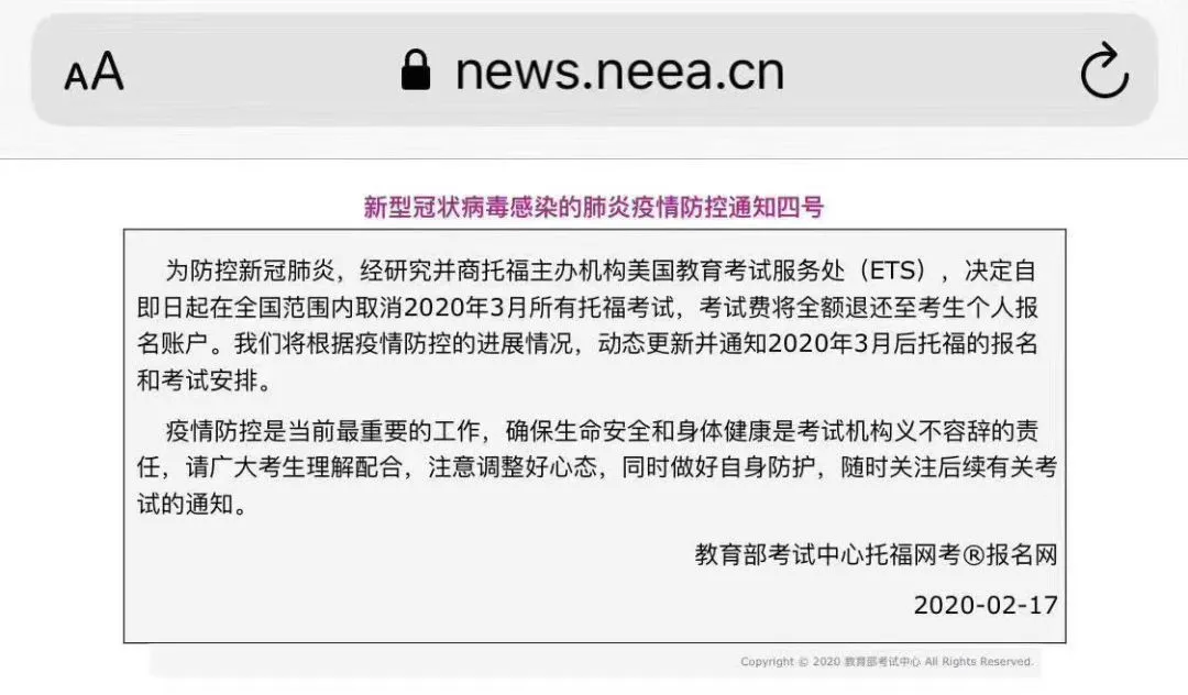 在托福取消之前,雅思也在2月14日宣布:经与教育部考试中心研究商讨决定自即日起在全国范围内取消2020年3月所有各类雅思考试,考试费将全额退还至考生个人报名账户。
