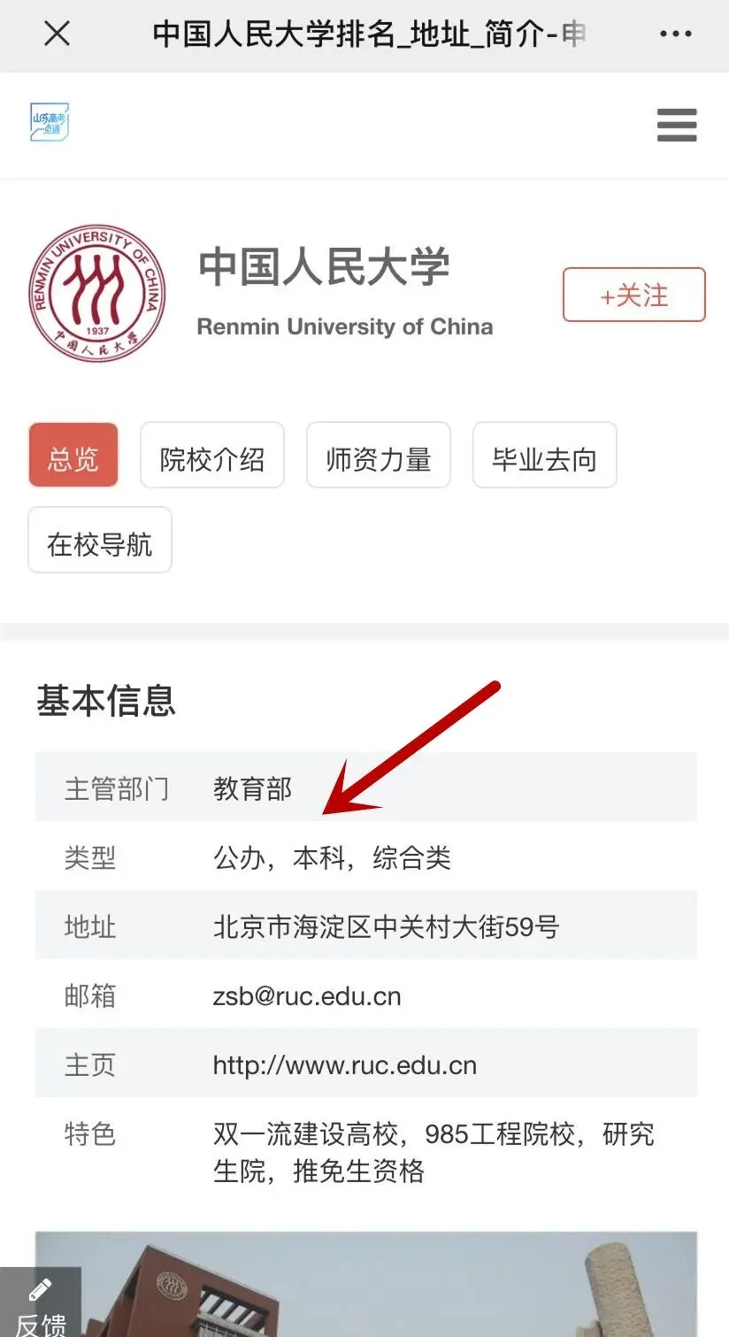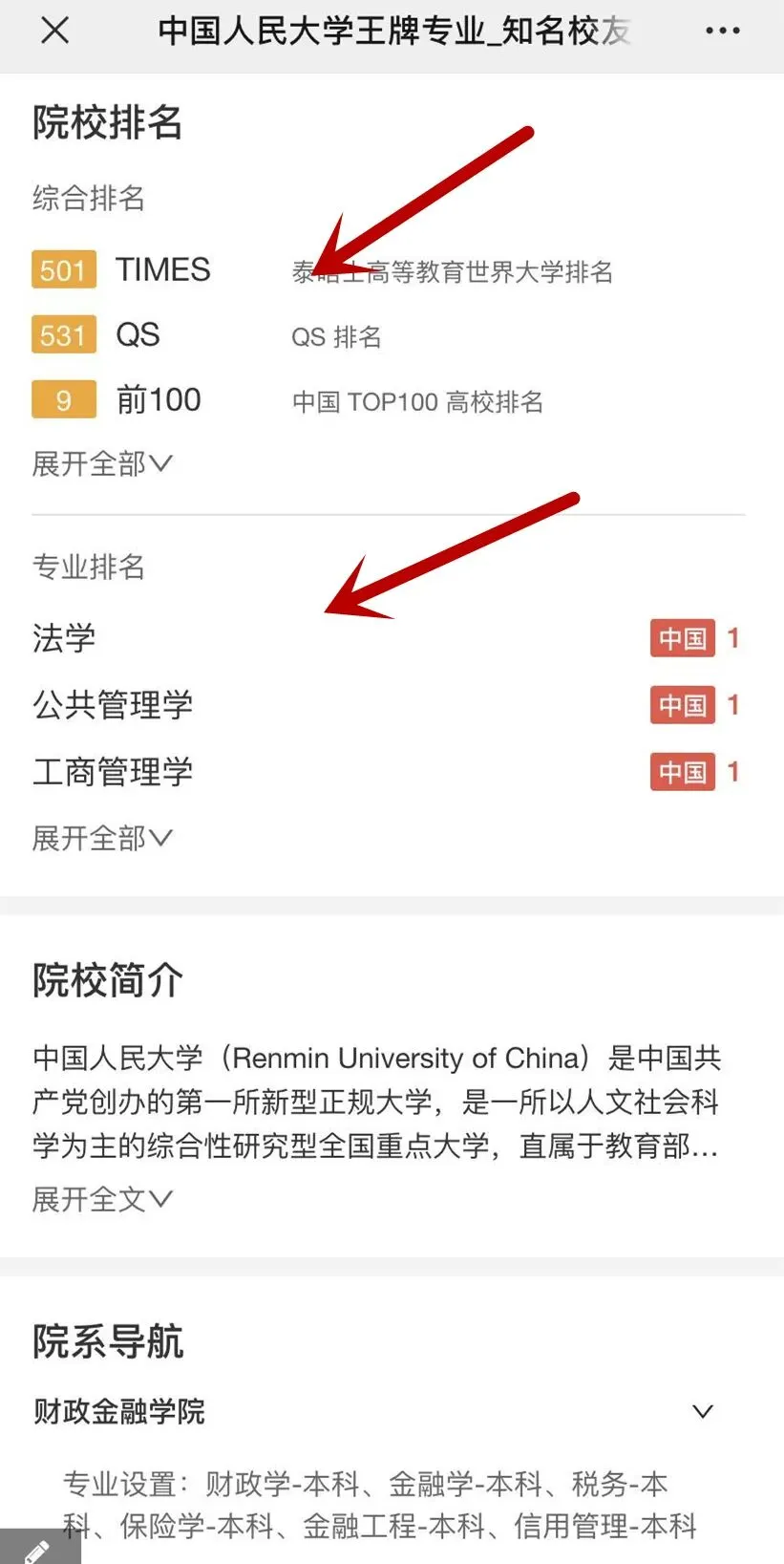进入到其中任意一个高校专区中,我们不仅可以直观的了解到各个学校的基本情况,例如院校介绍、师资力量、毕业去向等情况,还可查阅到学校的的各类排名情况。以中国人民大学为例,您可以在页面中浏览到学校的总体院校介绍、排名及专业排名、未来就业方向。