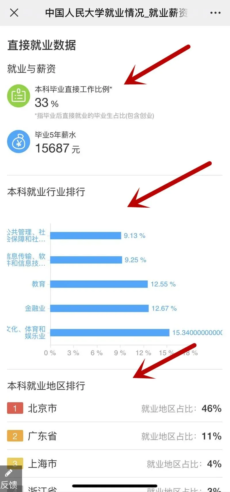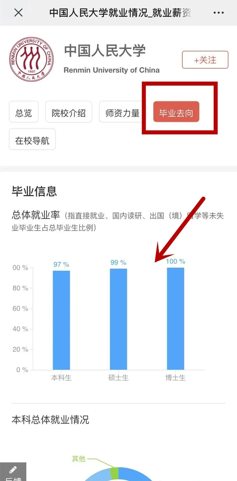 如果你比较在意学校未来的发展,也可在【毕业去向】中了解到学校总体就业率、专业就业率、本科就业等等信息。在您了解高校和升学途径上为您提供全面帮助。