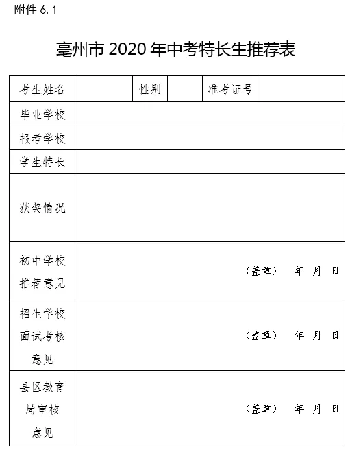 6月20日前,各高中学校在县区教育局基教科(股)的监督、指导下审核考生免试资格,组织特长生专业测试。亳州一中、亳州十八中特长生专业测试在市教育局基教科的监督、指导下组织实施。免试及专业测试合格考生的姓名、准考证号、性别、毕业学校等基本信息在招生学校及考生所属初中毕业学校公示3个工作日。
