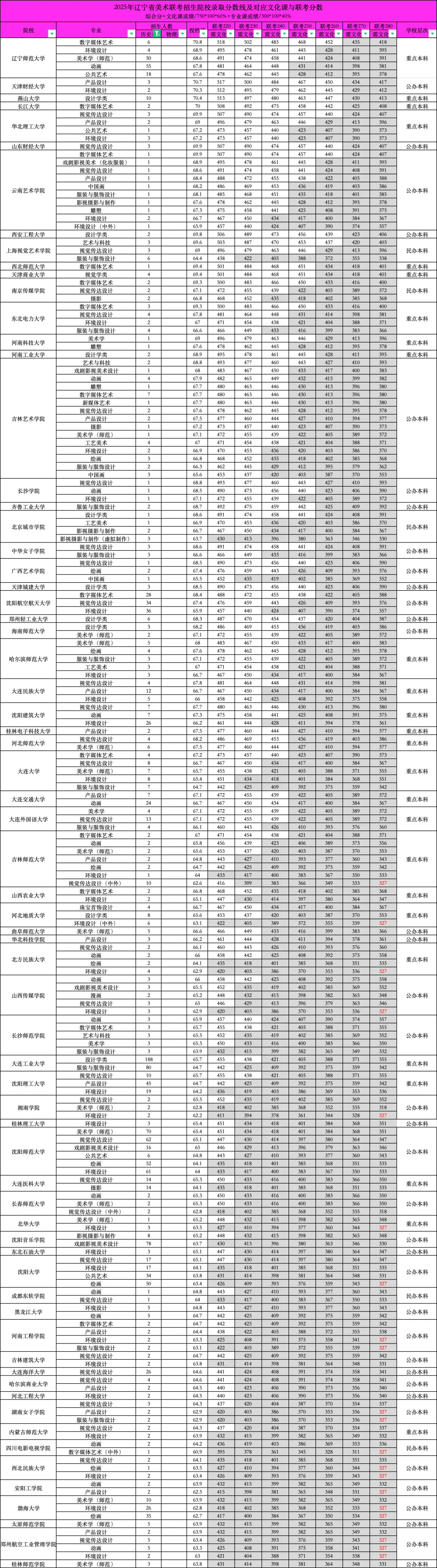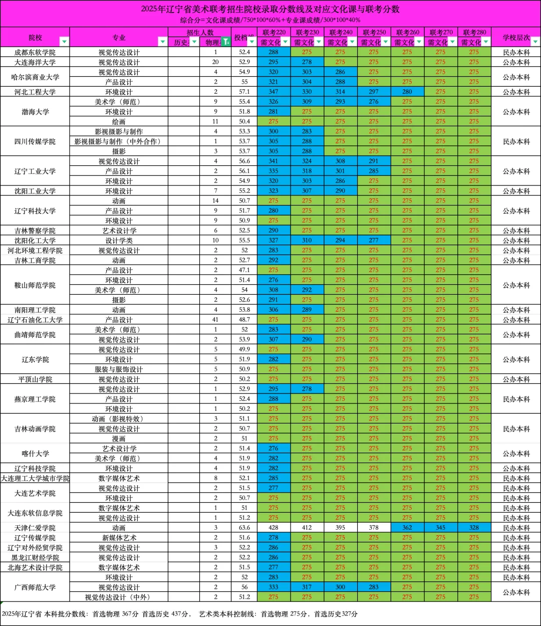 2025年辽宁省普通类本科批分数线:首选物理 367分 ,首选历史 437分, 艺术类本科控制线:首选物理 275分,首选历史327分 。特控线:首选物理515分,首选历史522分。报考清华美院需要文化课成绩过特控线。报考九大美院及其他校考院校需要文化课过普通本科线。