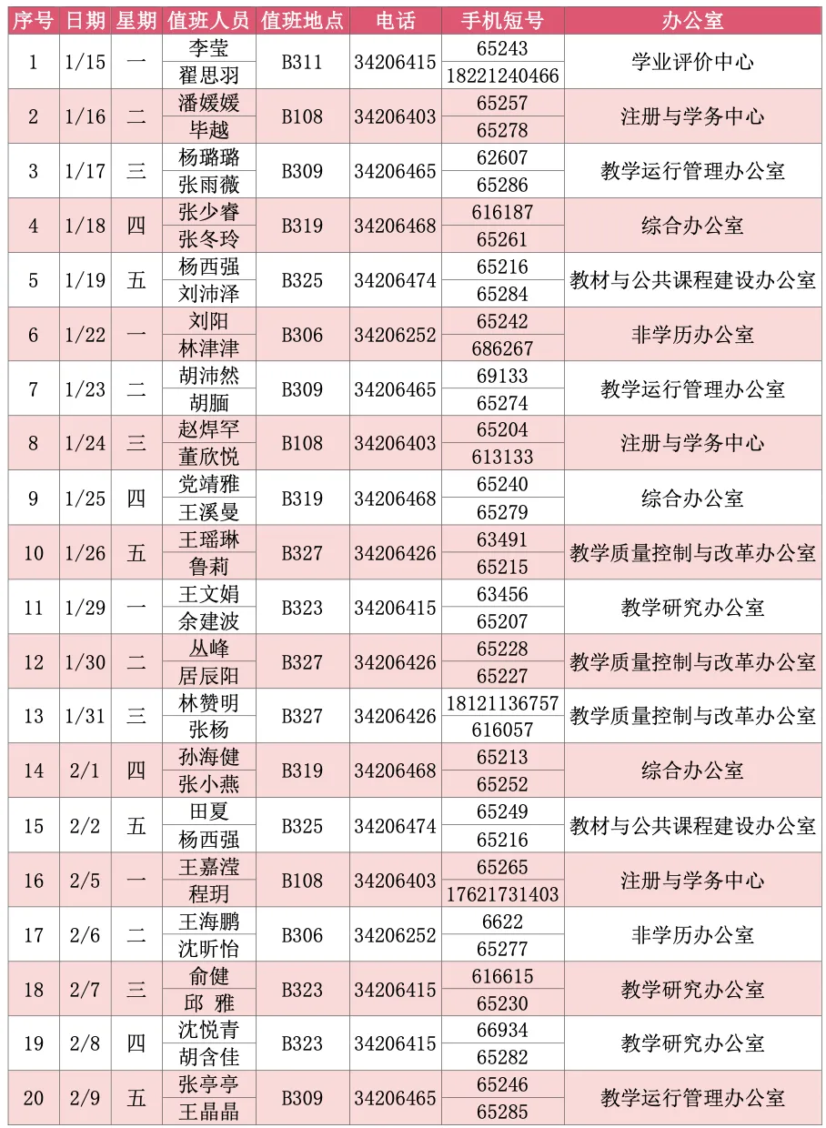 为方便全校师生寒假期间办理相关业务,现将教务处2024年寒假期间值班工作安排如下: