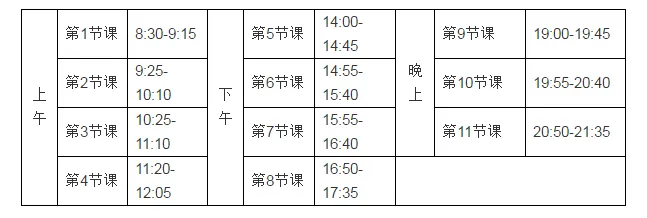 5月4日-5月15日(两周)上课期间实施错峰上、下课,《理论课临时课表》中所有教学班、体育课教学班作息按正常作息推迟半小时上课,顺延半小时下课,调整后作息时间如下: