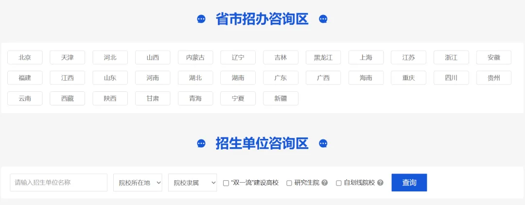 网上咨询分为两个区域,一个是省市招生办咨询区、一个是院校咨询区,下面具体讲讲各个区域分别可以问什么。