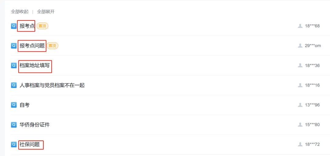 主要询问报考点的选择、档案、学历学籍信息、专项计划,比如少干计划、退役大学生士兵计划等政策性问题。