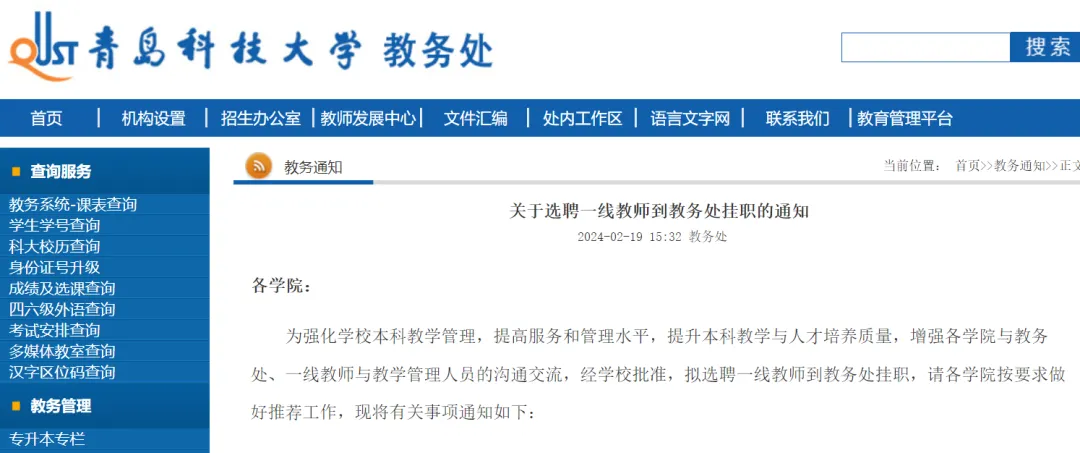 近日,青岛科技大学教务处发布了《关于选聘一线教师到教务处挂职的通知》。据悉,选聘教师挂职的是教务处处长助理,挂职一年,需坐班考勤,挂职期间的岗位任务和业绩考核参照学校管理岗位的职责要求进行。