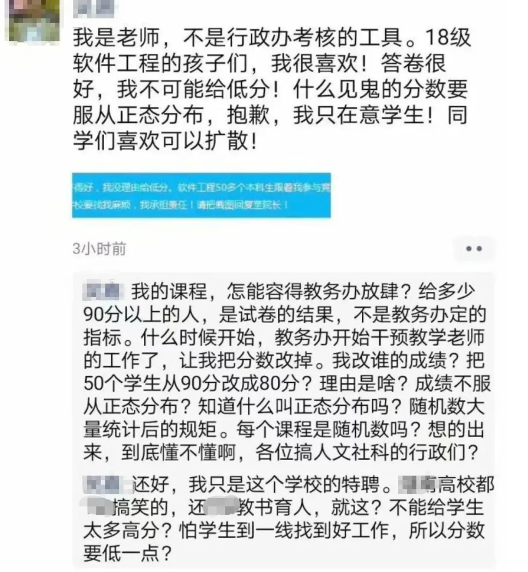 他在文中说:“我是老师,不是行政考核的工具。18级软件工程的孩子们,我很喜欢!什么见鬼的分数要服从正态分布,抱歉,我只在意学生!”