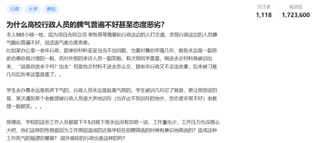 知乎上关于高校行政人员的问题浏览量超过 170 万,网友们纷纷分享自己与高校行政人员打交道时留下的不好印象。