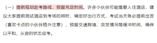 (二)提前熟悉考场及周边环境。对照考场分布图,明确所在楼栋、楼层及教室位置,同时确认卫生间、饮水处的分布情况。熟悉考场周边环境,如打印店、文具店、餐饮店,提前选好考后就餐点,优先选择距离近、口味清淡的店铺就餐,避免给肠胃增加负担,影响后面的考试状态。