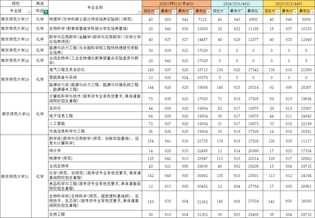 特别是化学(师范)、生物科学类、生物工程等专业,最低分在604-605分,位次在3万左右,是进入南师大的“门槛专业”之一