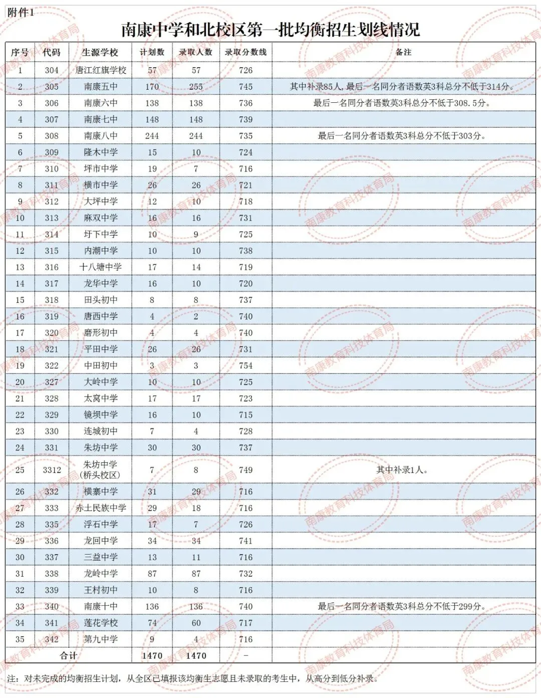 1.全南中学:因我县符合均衡生资格的生源不足,未完成的均衡生计划调剂为全南中学统招计划,根据考生第一志愿按初中学考总分从高分到低分进行录取,划定全南中学统招分数线为564分(其中语文83.5分)。