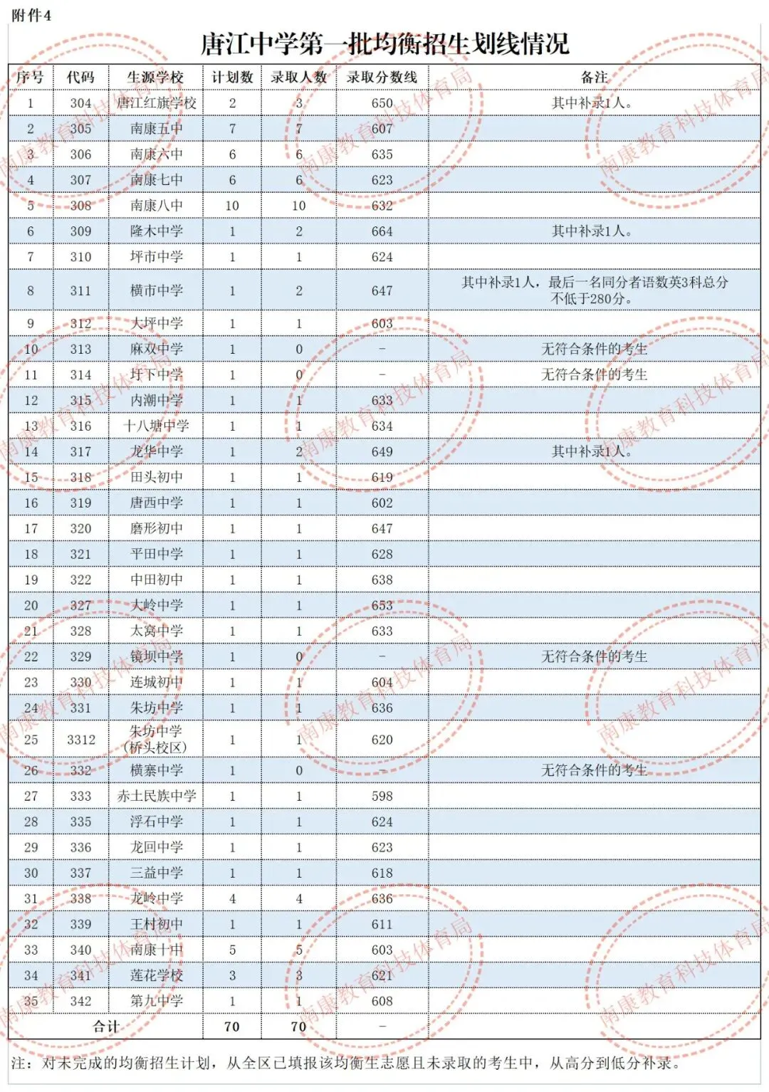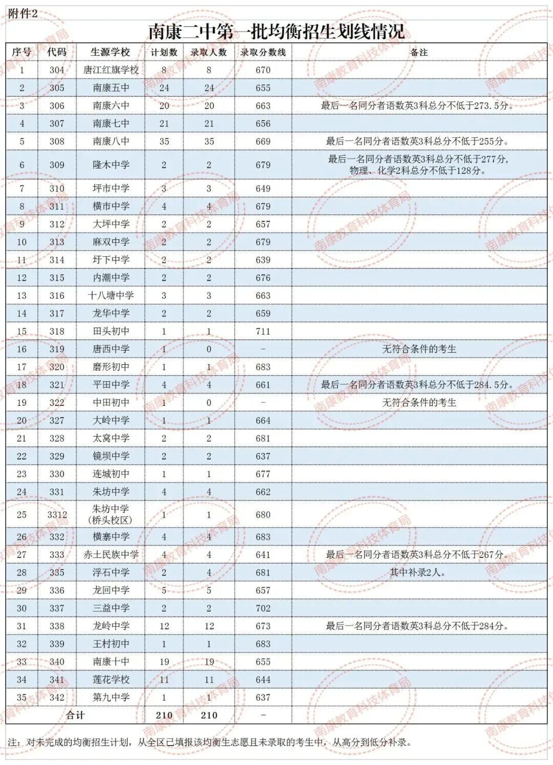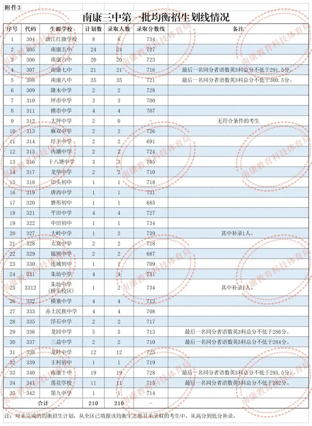 2.大余中学均衡招生全县最低控制线为643分。其中,各初中阶段学校大余中学均衡预录取分数线分别为:新城中学666分(且该校同分排名第一),新城镇中649分,樟斗中学646分,池江中学667分,青龙中学661分,左拔学校653分,黄龙中学690分,南安中学685分(且该校同分排名前三),浮江学校643分,吉村中学690分,河洞学校686分,内良学校675分,衡水学校645分。