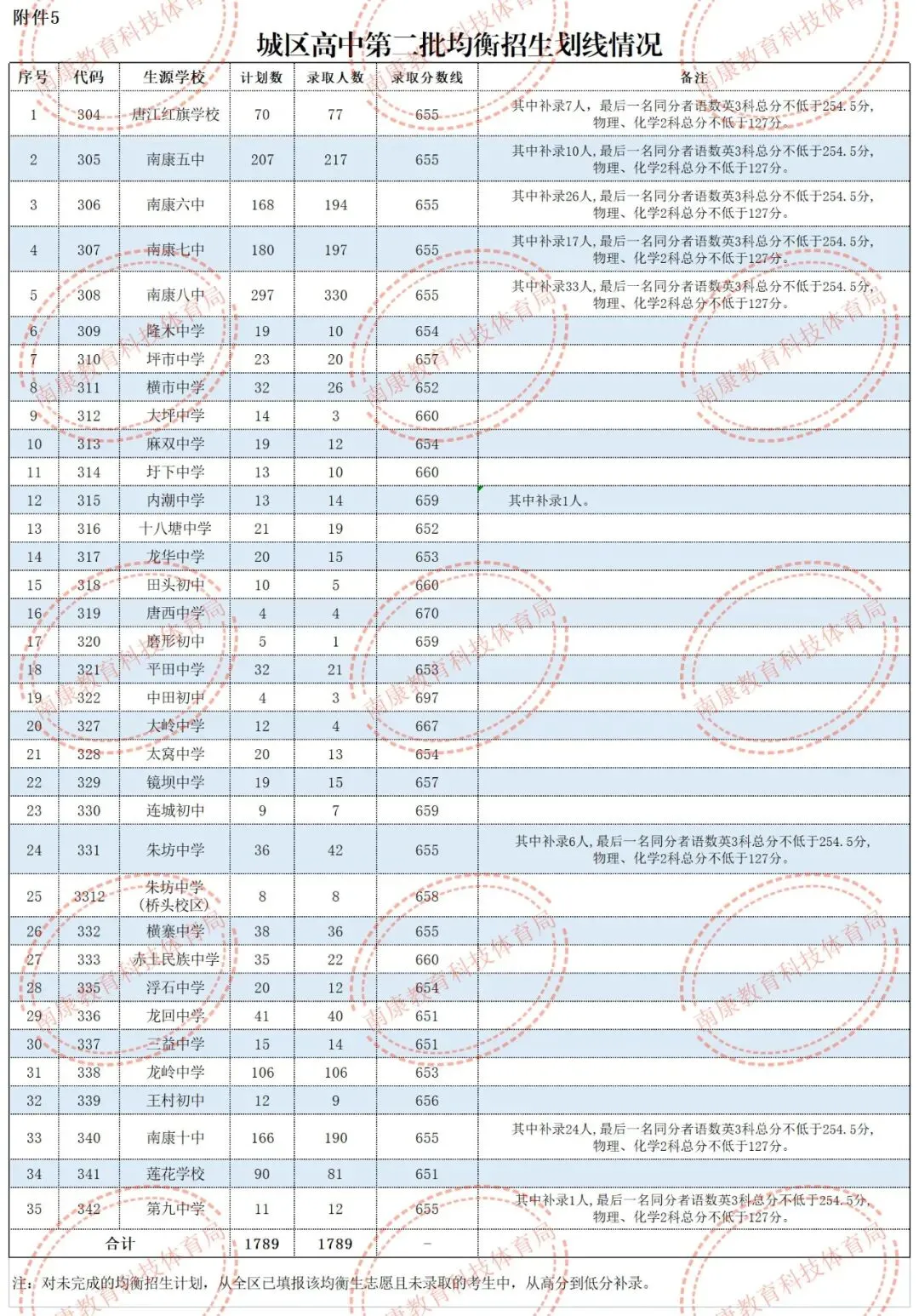 根据赣州市教育局《关于印发<赣州市2022年高中阶段学校考试招生工作规定>的通知》(赣市教教考字〔2022〕3号)精神,按照招生学校的招生计划及考生填报志愿,从高分到低分录取,最后一名总分相同者全部录取的原则,经龙南市中招委会议研究,现将龙南中学、实验中学录取分数线公告如下: