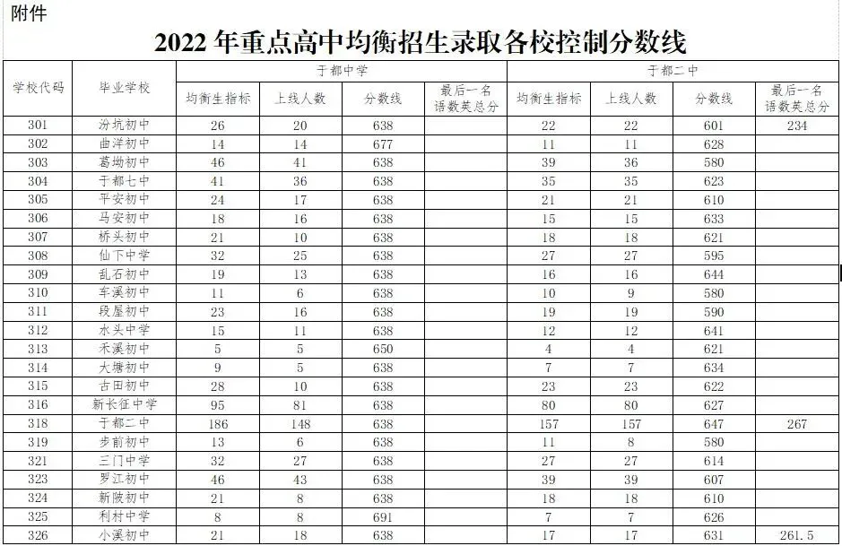 1.于都中学统招录取分数线为758分(758分考生语数英总分不低于314分);均衡录取最低控制分数线为638分,均衡调剂分数线为663分(663分考生语数英总分不低于260分)。