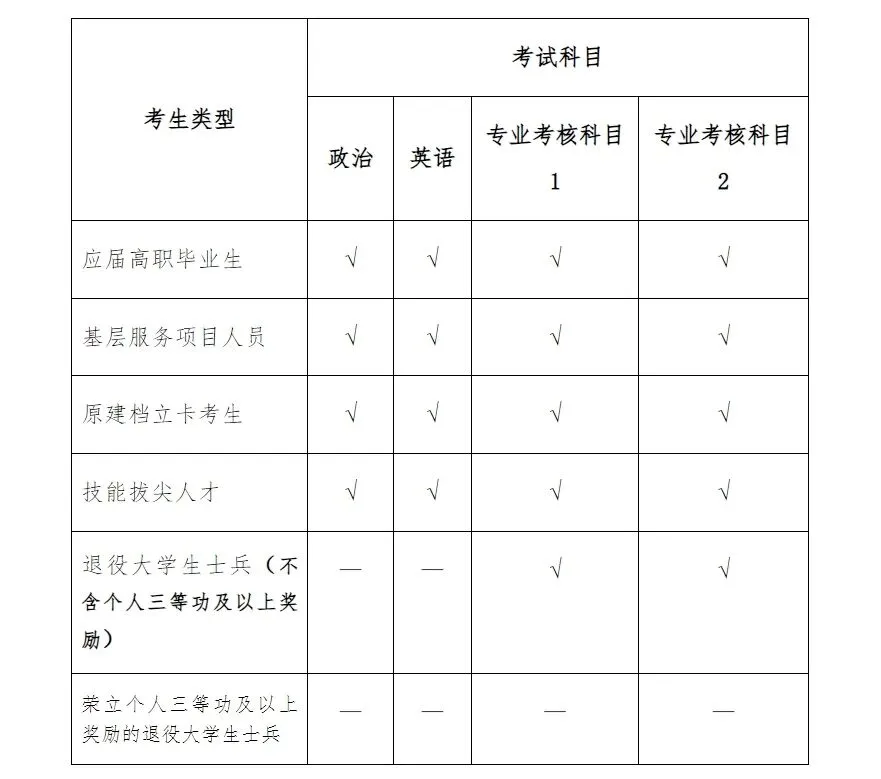 按照《河北省教育厅关于优化调整河北省普通专升本考试科类及科目设置的通知》(冀教学〔2023〕19 号)要求,普通专升本考试科目设公共文化考试和专业综合(职业适应性)考核(简称“专业综合考核”,下同)两部分,总分500分。公共文化考试包含政治、英语2个科目,每科目满分100分。专业综合考核包含专业考核科目1和专业考核科目2(详见上述通知附件2),每科目满分150分。各类考生具体考试科目如下(‘√’表示需要参加考试,‘—’表示免试):