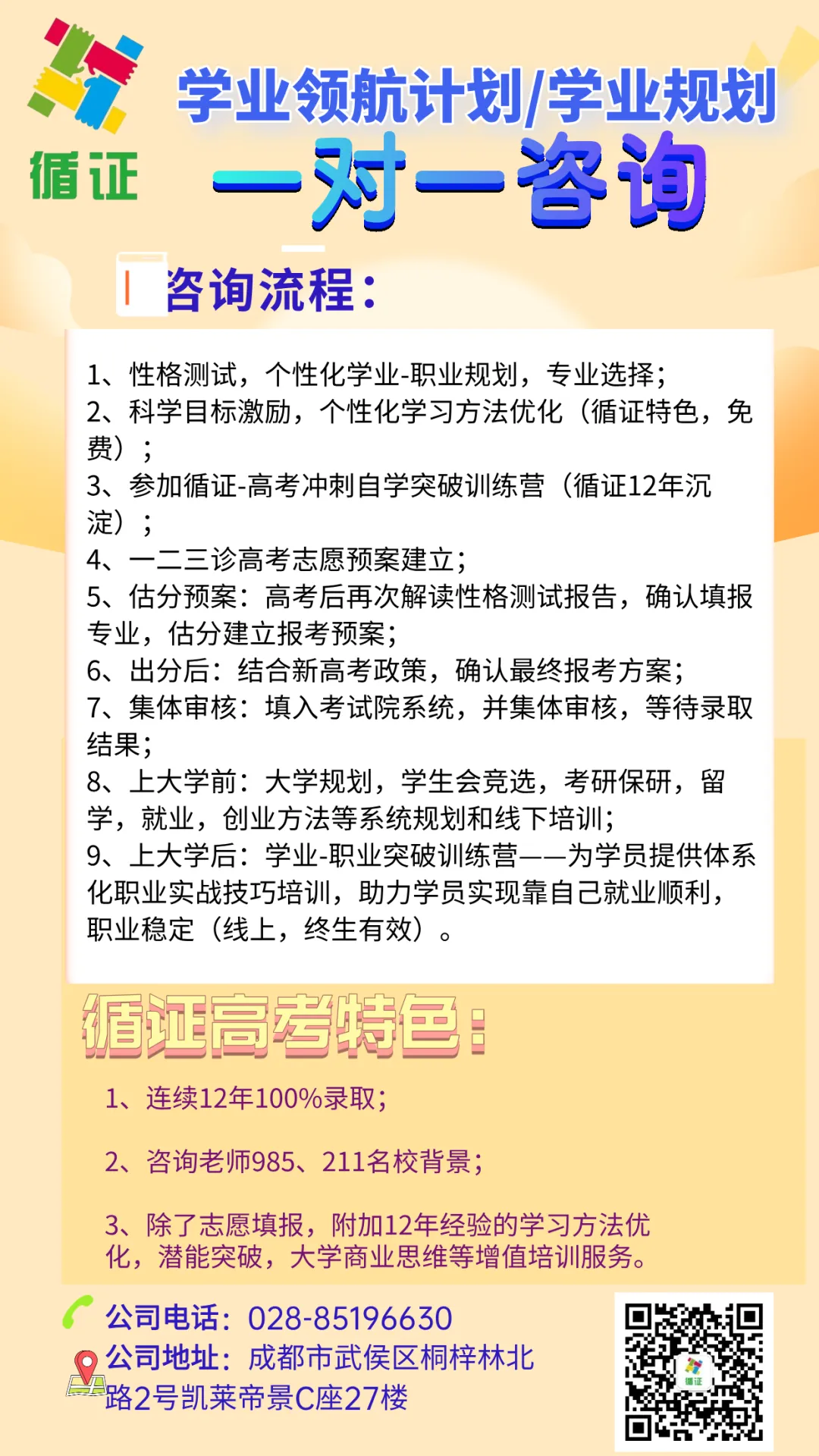 参加循证-高考冲刺自学突破训练营(循证12年沉淀);高考后再次解读性格测试报告,确认填报专业,估分建立报考预案;