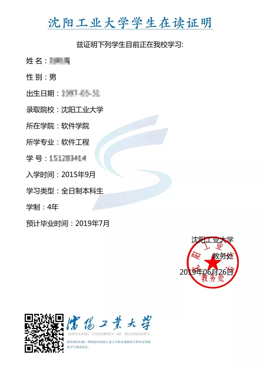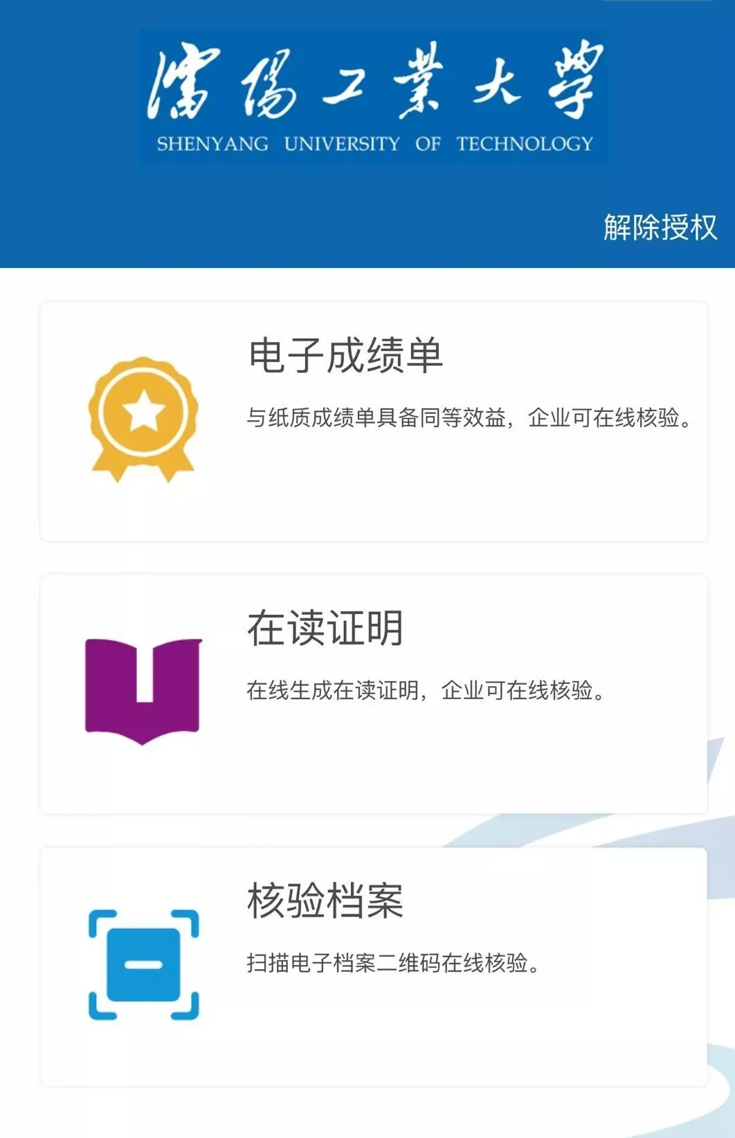 在校生使用微信扫描二维码访问公众号“沈阳工业大学教务通”,根据提示完成绑定,即可查询自己的电子档案。每份电子成绩单从创建起,系统保留1年快照可供核验。电子成绩单通过在PDF版式电子成绩单上加盖可靠电子章实现防伪,并可通过二维码进行验证。有效地保证了成绩单的真实、有效、防伪性。
