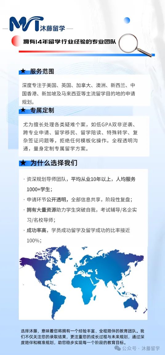 沐藤留学作为一家专注于国际教育规划的高端咨询机构,拥有14年资深行业经验,深度专注于美国、英国、加拿大、澳洲、中国香港、新西兰、新加坡等主流留学目的地的申请规划 。