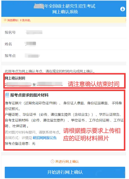 核对报名号、姓名、报考点,阅读上传图片材料要求等,确认开始时间、结束时间后点击“开始网上确认”。