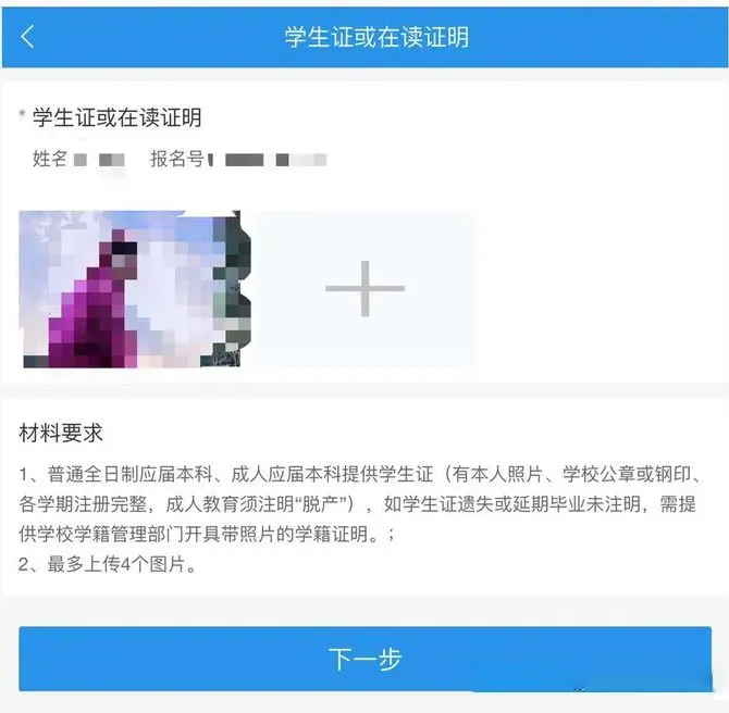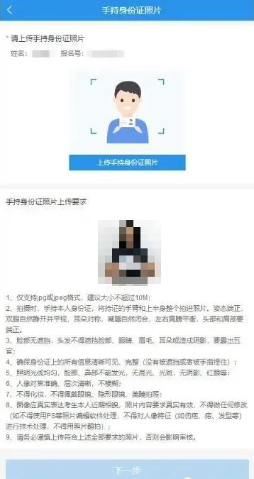 *系统对不合格材料会在页面左上方提示不合格原因,同时上传材料按钮为蓝色可操作按钮,已审核合格的图像上传材料按钮为浅蓝色,不可操作。逐条点击“下一步”,查看并重新上传材料,重新提交审核。(如果第二次补充材料依然没通过,可能还会有第三次,这个不同报考点的要求不一样,依然不通过的话,可能就需要现场审核了)