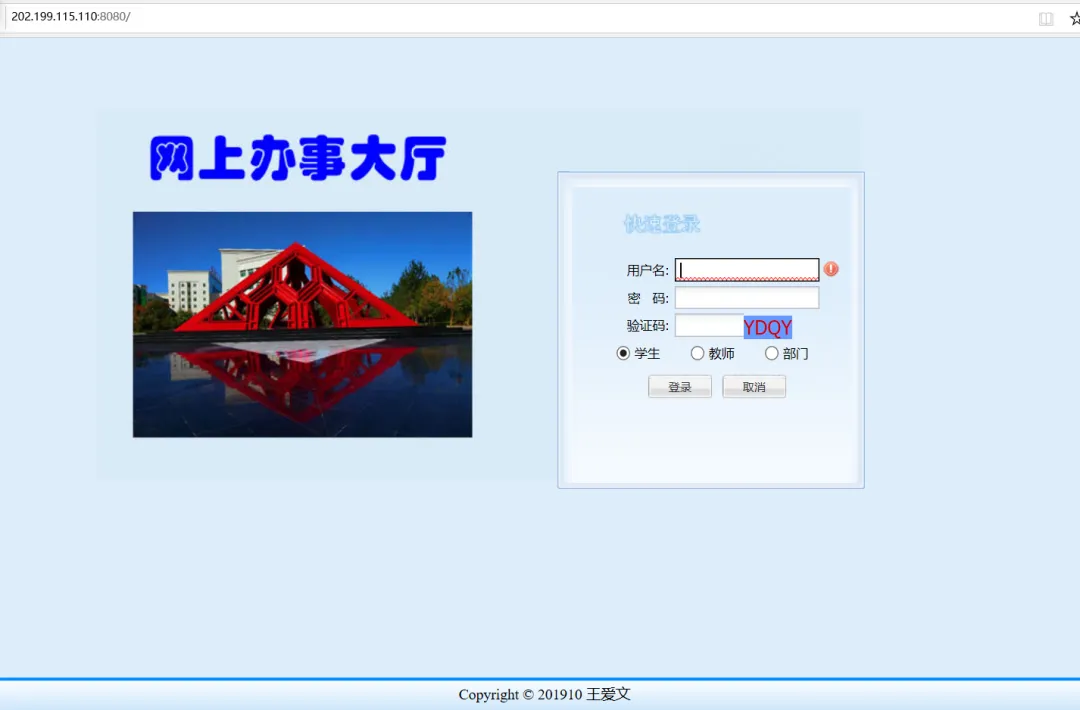 网上办事大厅目前只允许在校园网内访问,校园网外访问请大家先登录VPN,大家可以通过教务处网站链接进行访问,也可通过http://202.199.115.110:8080地址直接登录,登录界面如下图所示。