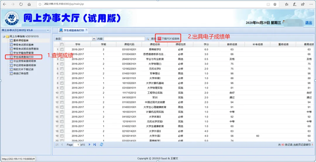 学生登录进系统后先选择左侧“网上办事指南”下的“学生成绩打印”,系统经过数据检索后会在界面的右侧显示学生的所有课程成绩。