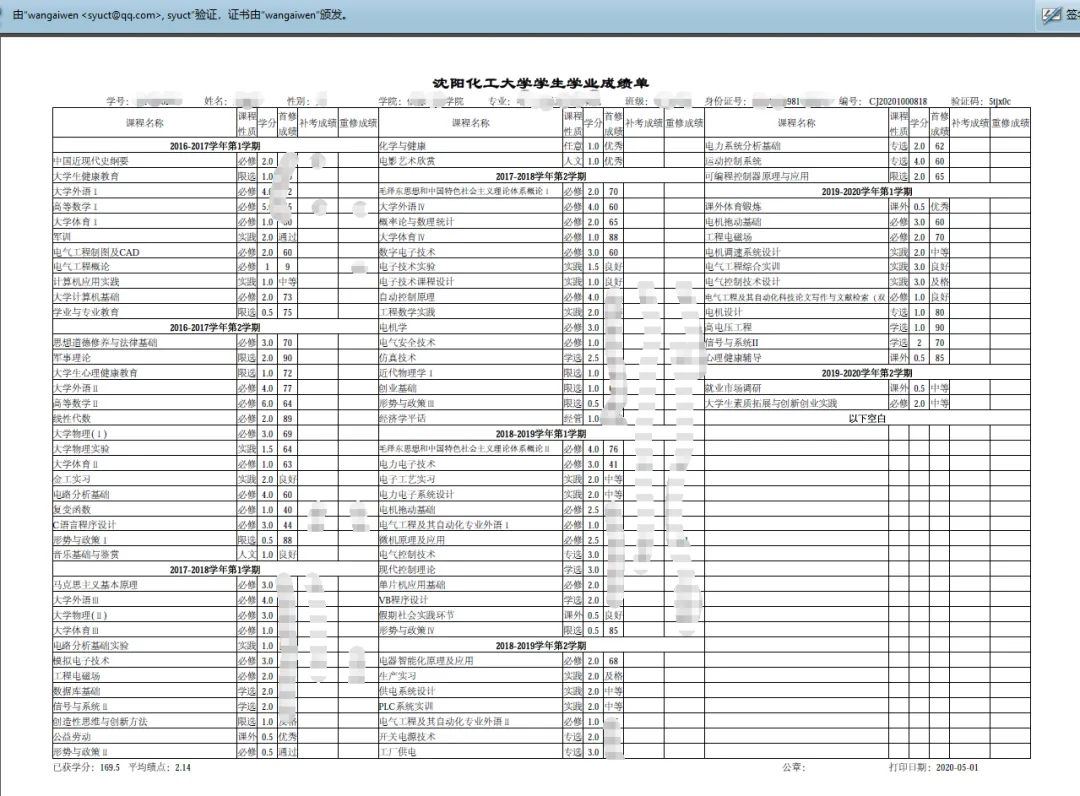 点击上图右侧上方的“下载PDF成绩单”,系统将为学生出具一份有数字签名的PDF格式电子版成绩单,具体样式如下图所示: