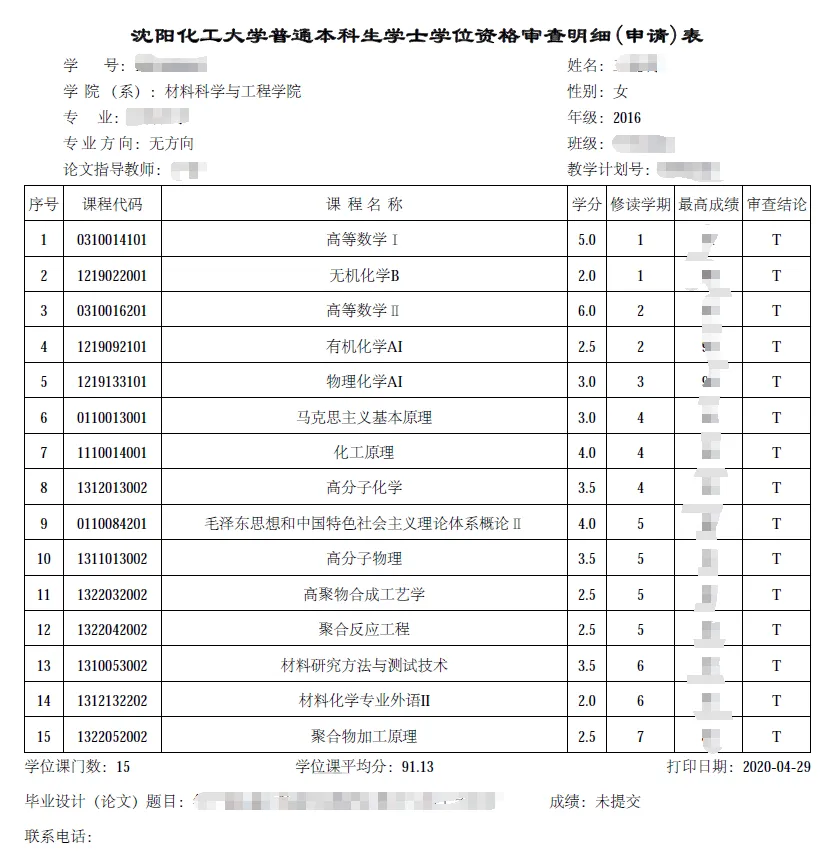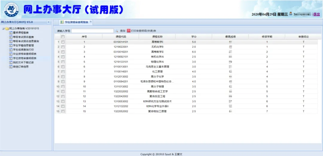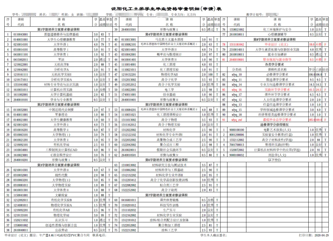 点击上方的“打印审查明细(申请)表-PDF”将为学生生成一个离线的PDF审查明细文件,红色显示的为没达到审查标准要求的课程,详细信息如下图所示:
