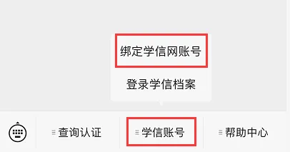 考生通过以下方法使用微信绑定学信网账号,可接收“学历(学籍)校验结果”“交费结果通知”等提醒。
