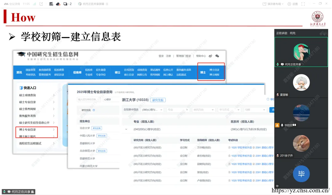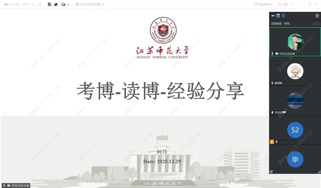 上半场,何月以线上形式围绕“要不要读博”“如何申请博士”以及“读博后的感受”三部分展开分享。她首先提醒与会同学,读博并非坦途,需以理性思维审视自身适配性,并指出家庭支持、科研兴趣与个人学术能力是支撑读博之路的三大关键支柱。随后,她结合个人申博时间线,系统梳理了院校与导师选择、研究计划撰写、面试考核等环节的具体策略与实用技巧。谈及读博感受,何月坦言科研之路常伴随孤独与压力,鼓励大家提前做好心理建设,积极进行自我调适,主动适应新环境。