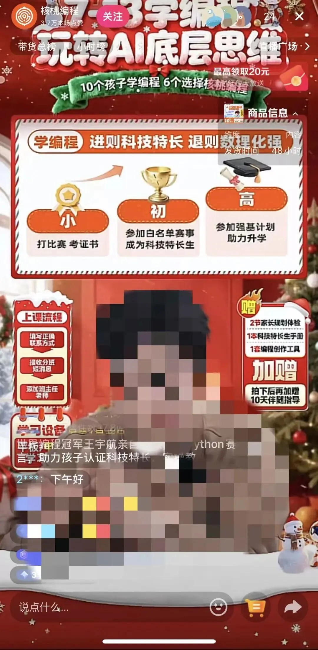 西安二年级学生家长李女士就被说动了:“身边朋友都在给孩子报班,直播间说三天能拿国字号证书,还能给小升初加分,实在忍不住想试试。”这些机构深谙营销套路,先用9.8元、10.9元的低价试听课吸引家长,这类试听课销量普遍过万,千元级正课订单也轻松破千。
