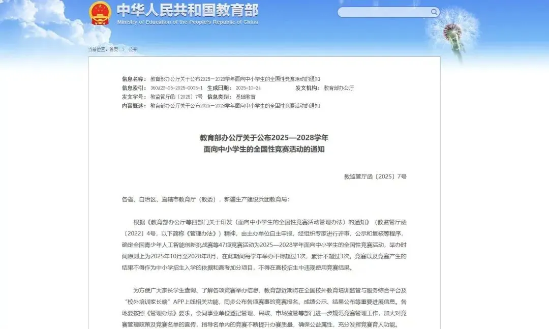 事实并非如此。教育部早已明确规定,竞赛结果不得作为中小学招生入学依据和高考加分项目,2025—2028学年全国性竞赛名单公布时,再次重申了这一要求。