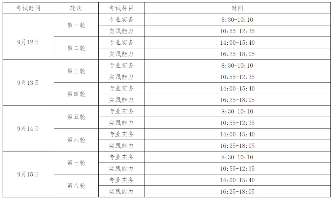 为贯彻落实党中央、国务院重要决策部署,按照新冠肺炎疫情防控工作有关要求,全国护士执业资格考试委员会办公室研究决定,2020年护士执业资格考试延期至9月12—15 日举行。为保证考试顺利进行,现将有关问题通知如下:一、考试不再重新组织报名,其他考务工作安排由国家卫生健康委人才交流服务中心另行通知。二、考试每半天为一个轮次,各地根据报名人数、机器数合理安排考试的轮次。具体安排如下: