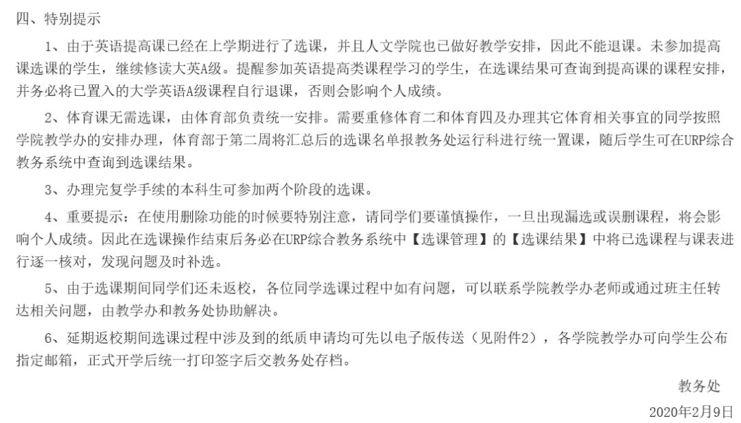 6、延期返校期间选课过程中涉及到的纸质申请均可先以电子版传送(见附件2),各学院教学办可向学生公布指定邮箱,正式开学后统一打印签字后交教务处存档。