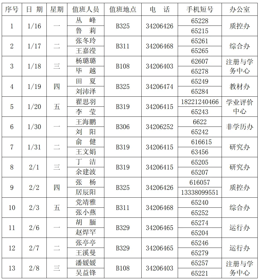 为方便全校师生寒假期间办理相关业务,现将教务处2023年寒假期间值班工作安排如下: