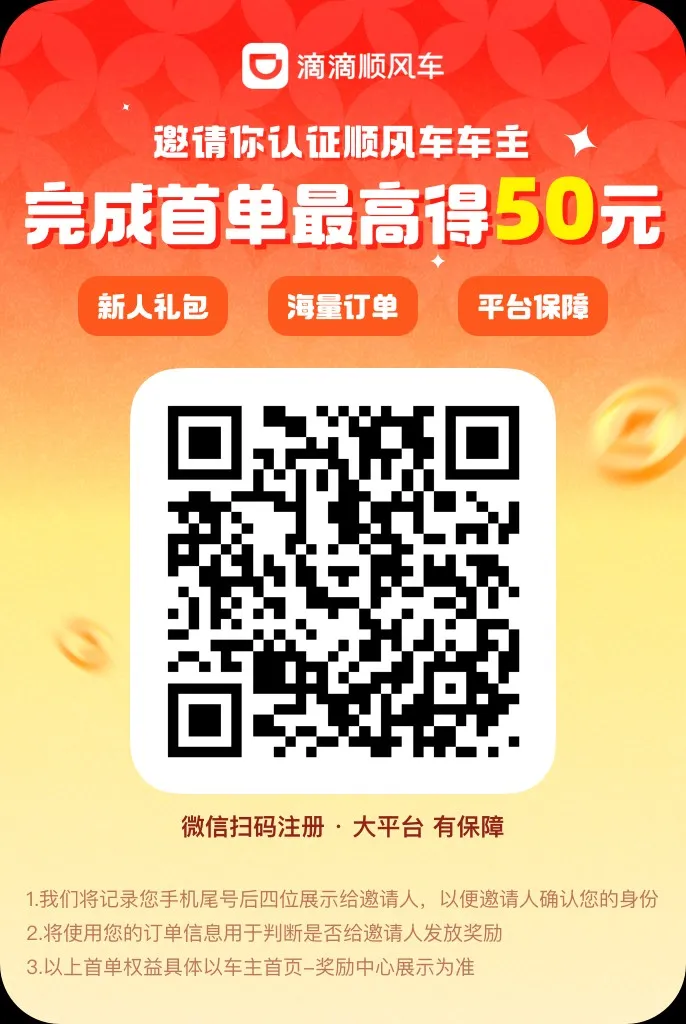 现在注册滴滴顺风车,完成首单有50元奖励!