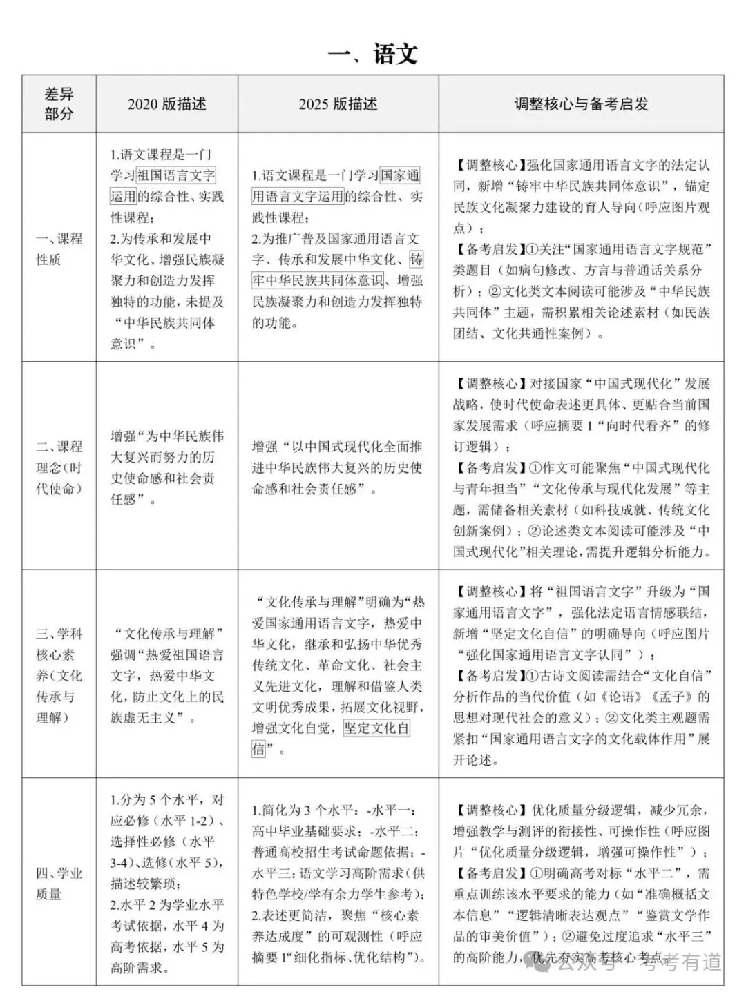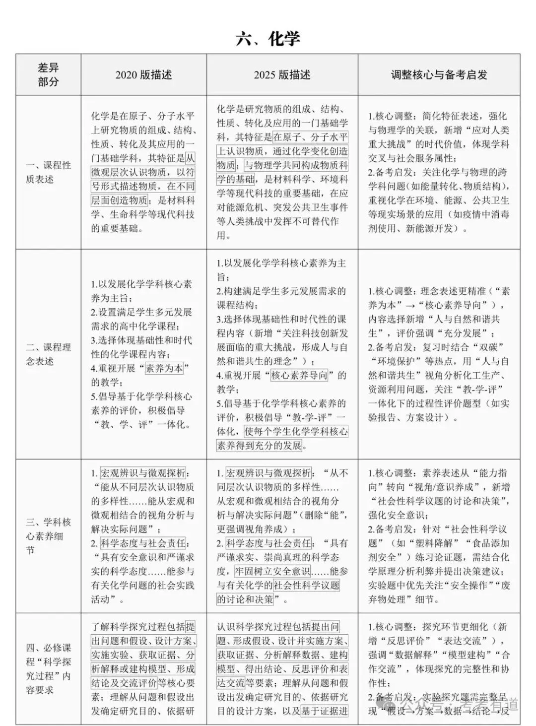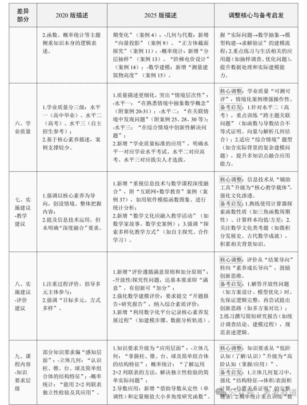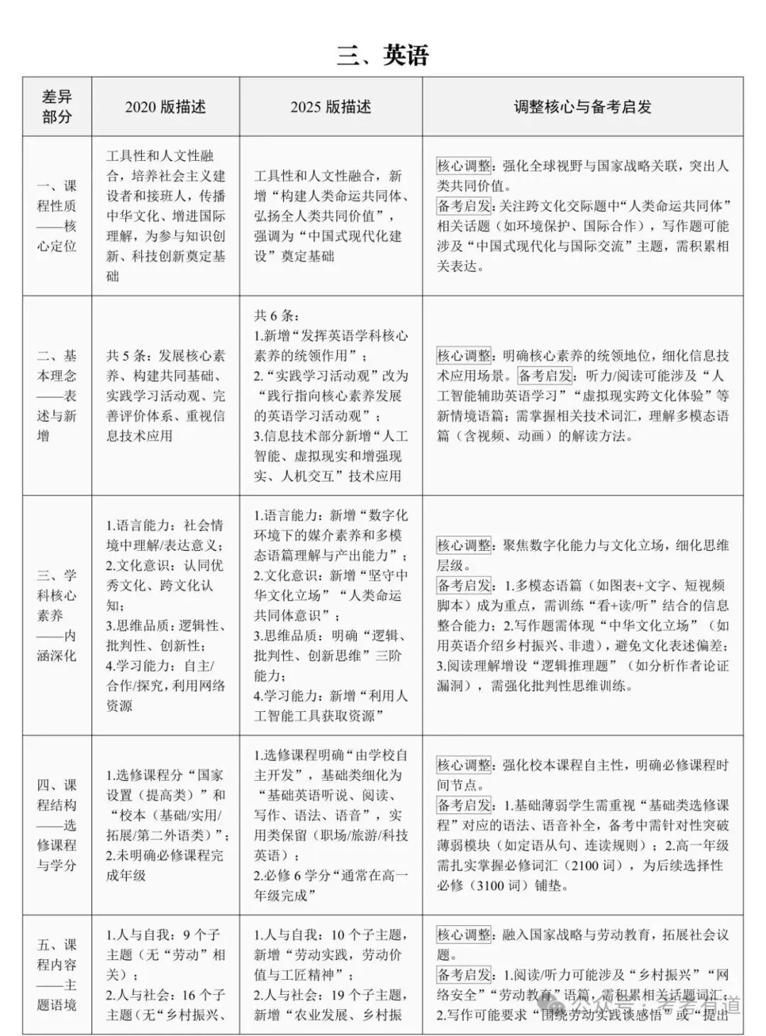 现将《普通高中课程标准(2025年修订版)》与《普通高中课程标准(2020年修订版)》核心变化对比表分享给我省师生,大家可结合《普通高中课程标准(2025年修订版)》原文一同研习。