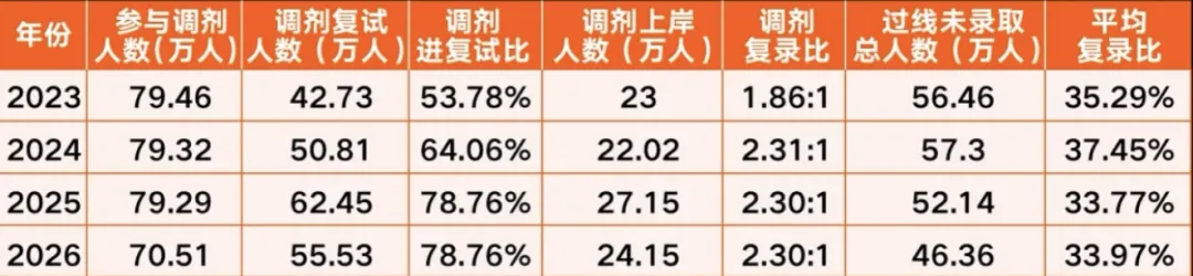 这意味着,即便过线人数增加,一志愿的复录比未必优于25考研。那么,调剂空间是否会因此放大?答案并不乐观。
