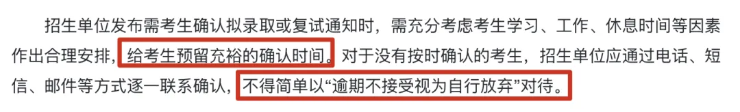 院校在发布拟录取或复试确认通知时,需为考生预留合理的确认时间,并综合考虑学习、工作与作息因素。对于未按时确认的考生,招生单位应通过电话、短信、邮件等方式进行联系,不得简单以“逾期视为放弃”处理。