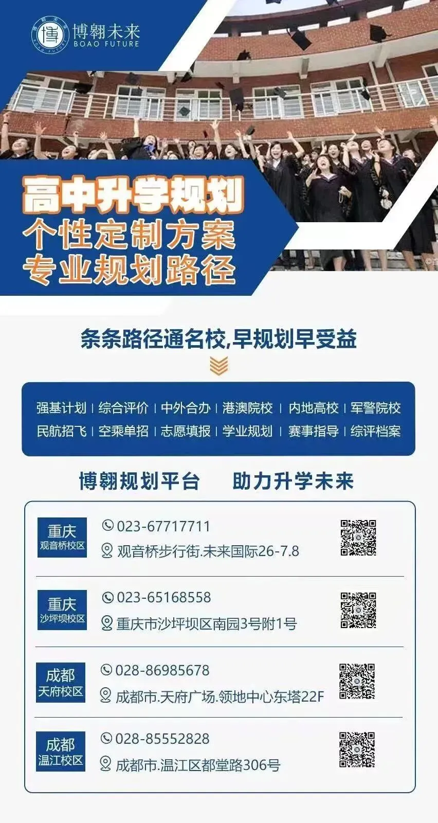 重庆博翱未来致力于将高中升大学一站式服务做到极致,全方位帮助学生把握住每一个升学机会。从“0”批次的保送、强基计划、三大招飞等升学路径;到提前批A段的军校、警校、综评招生以及各大官校的招生政策;再到提前批B段的公费师范生、专项计划、定向培养的录取要求;最后到普通批的96个专业平行志愿的填报工作。
