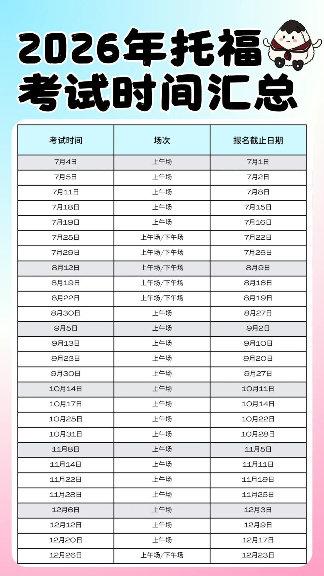 左右滑动查看2026年托福考试时间