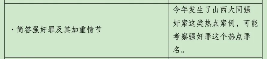 2.近年来对于知识的考察更加细致和深入,不仅停留于表面的基础知识以及表层概念,同时对基础概念的下一层级的子概念有所考察,例如对于轮奸的考察,轮奸本属于强奸罪的加重情节之一,题目并未考察强奸罪的犯罪构成,而是进一步深入考察轮奸的犯罪构成,且前几年也考察过信用卡诈骗罪中恶意透支的名词解释,由此可见刑法对于分则罪名的考察更加细致和深入。