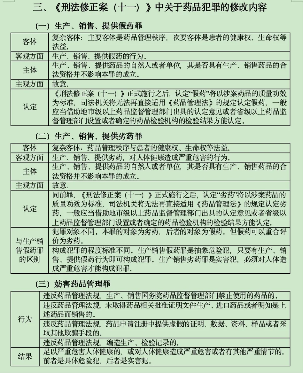 【答案出处】精讲笔记p153-155,p268《刑法修正案(十一)》中对药品犯罪修改内容。冲刺笔记p63-64。基本能覆盖本题答案,需要灵活作答。