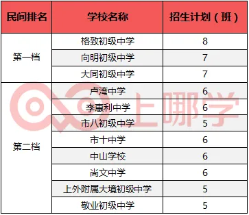 可以看出,格致初中、向明初中、大同初中、卢湾中学、应昌期、尚文中学、市十中学等7所学校是没有在列的,也就是小学如果不在本区就读,小升初回户籍地就读,是没有机会进这些学校的,如果目标初中是这几所,那么小学就不能到外区就读。