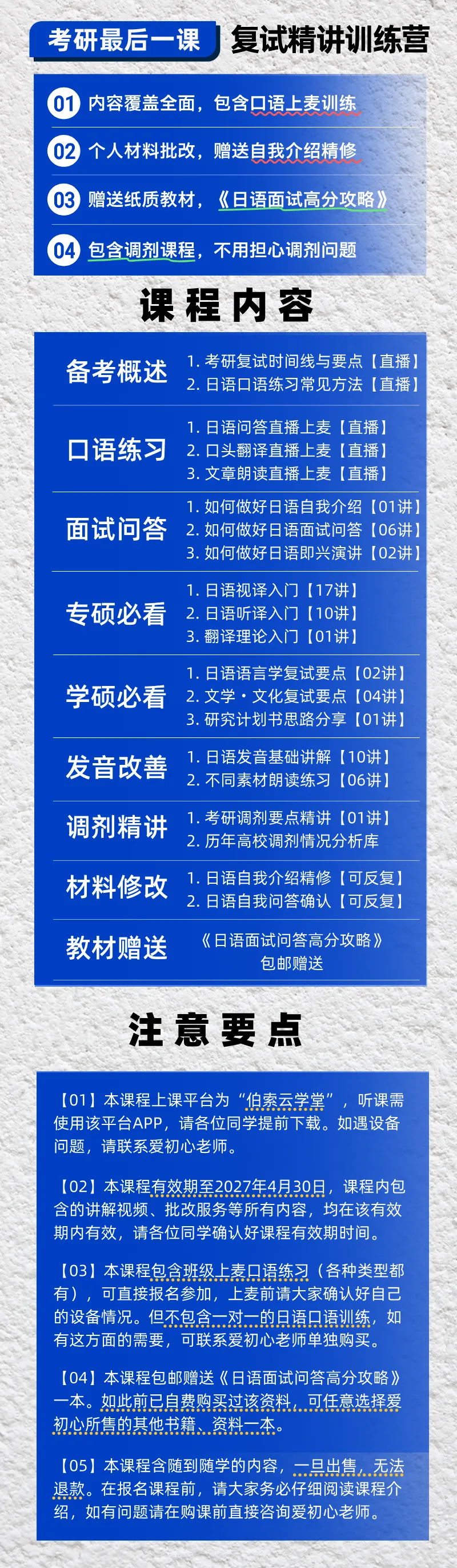 A:这个课主要包括复试干货讲解、班级上麦训练、赠送纸质教材、自我介绍修改等,不包含一对一纠音、面试服务。具体课程内容详见下方【课程详情】,如有需要单独的一对一面试等服务,欢迎向助教进行咨询。