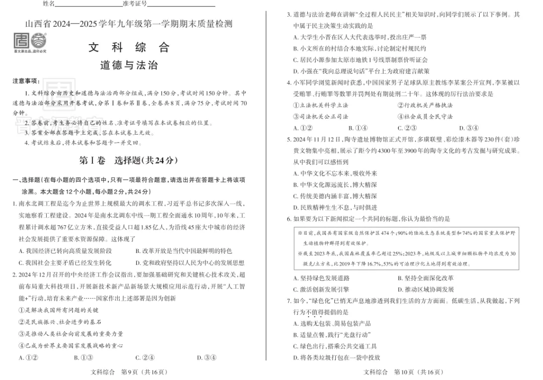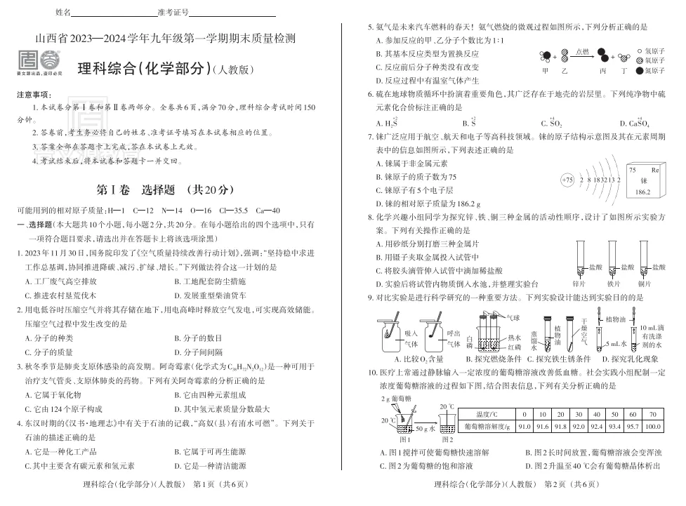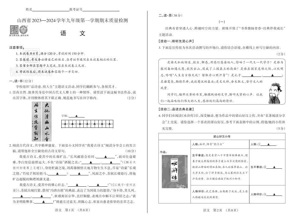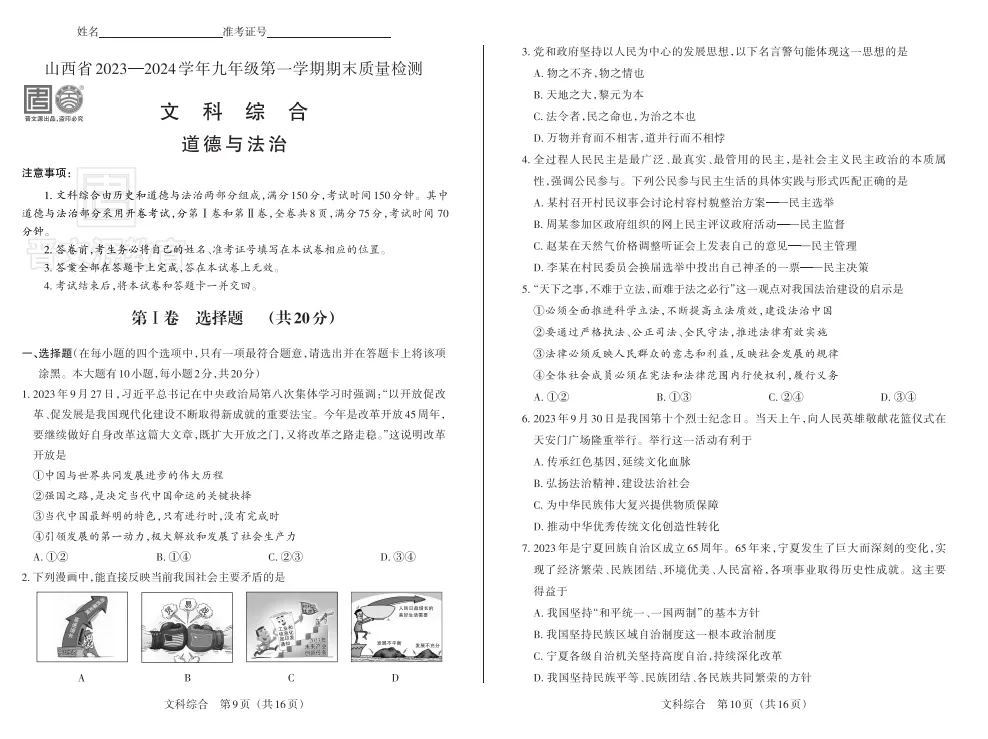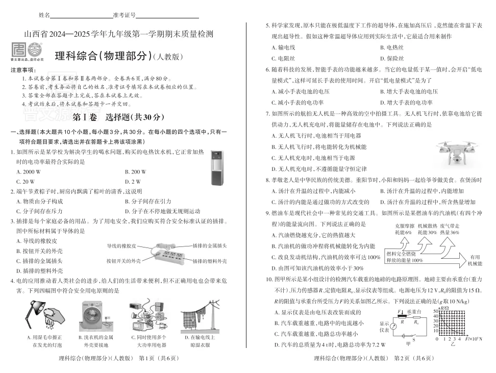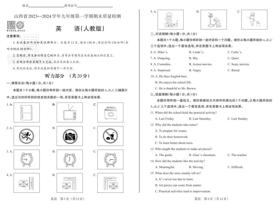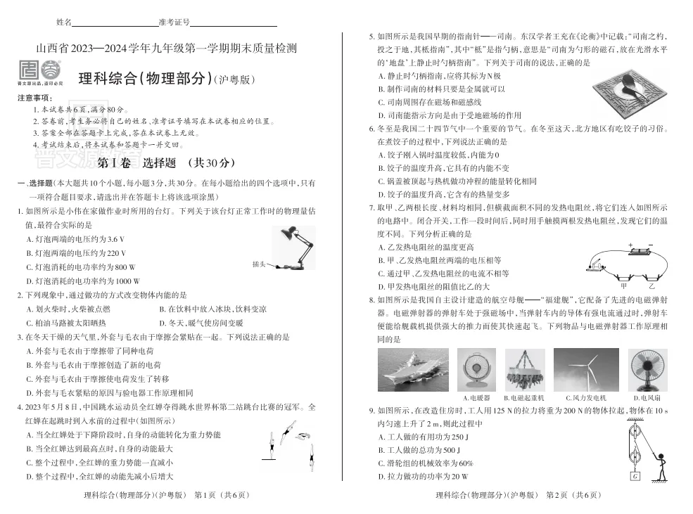 【期末试卷】山西省九年级近两年期末考试试卷及答案免费下载